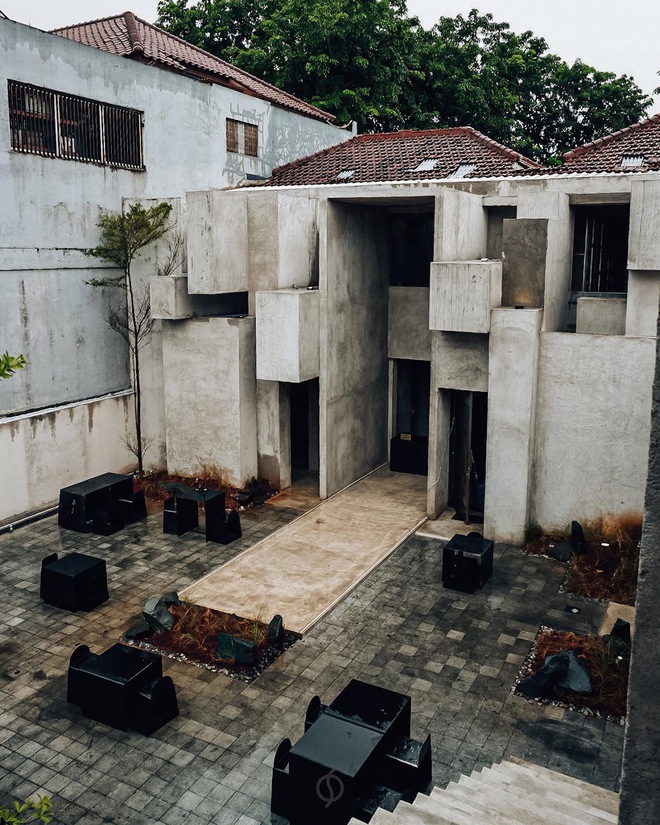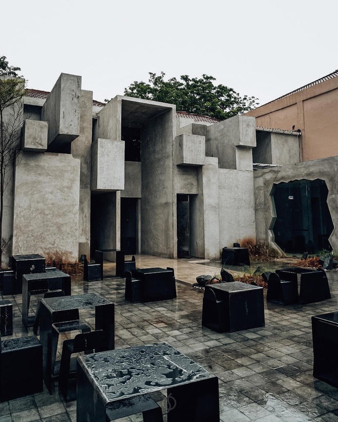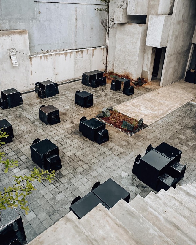 Tuy nhiên, thứ gây dân tình bàn tán xôn xao hơn cả chính là ở không gian bên ngoài của quán với những bộ bàn ghế đen kịt giữa khoảng sân rộng lớn, bao quanh là các bức tường cao màu xám, tạo cảm giác có đôi chút…lạnh lẽo.